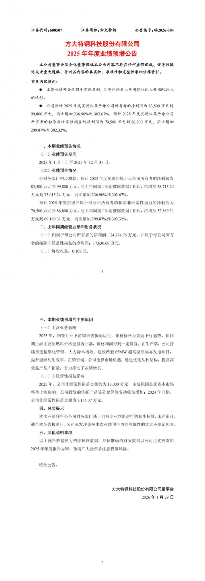 方大特钢公告称,预计2025年度归属于上市公司股东的净利润为8.35亿元-9.98亿元,同比增加236.90%-302.67%。2025年,钢铁行业下游需求仍偏弱运行,钢材价格呈震荡下行态势,但同期上游主要原燃料价格也显著回落,钢材利润得到一定修复。在生产端,公司持续推进精细化管理,大力降本增效;建设两套65MW超高温亚临界发电项目,提升能源利用效率。在销售端,公司抢抓市场机遇,通过优化品种结构,提高高效益产品产销量,有力推动了业绩增长。