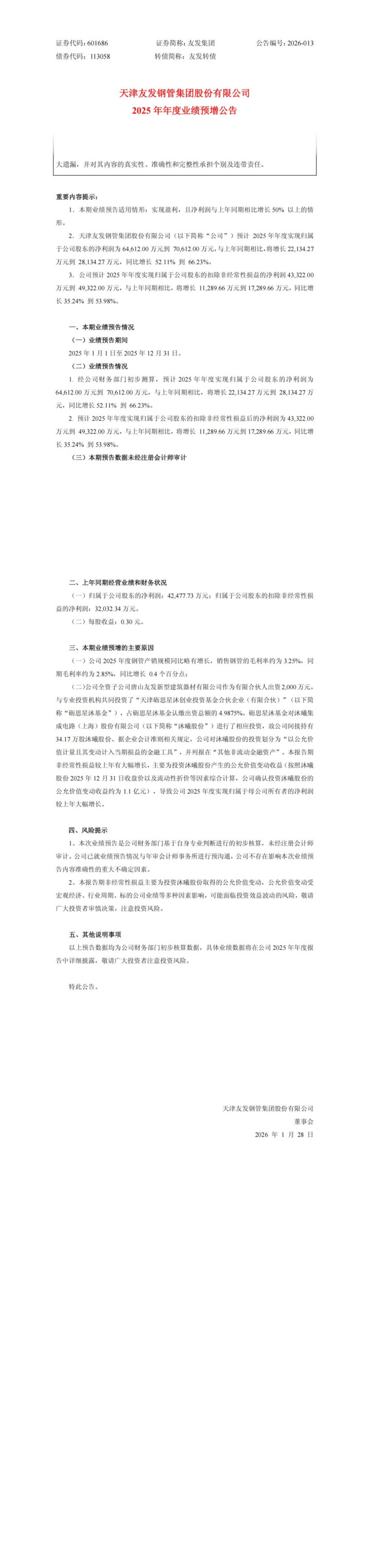友发集团公告称,预计2025年归属于上市公司股东的净利润为6.46亿元至7.06亿元,同比增长52.11%至66.23%。业绩增长主要系钢管产销规模同比略有增长、毛利率提升0.4个百分点,以及对沐曦股份的投资产生约1.1亿元公允价值变动收益,带动非经常性损益大幅增加。